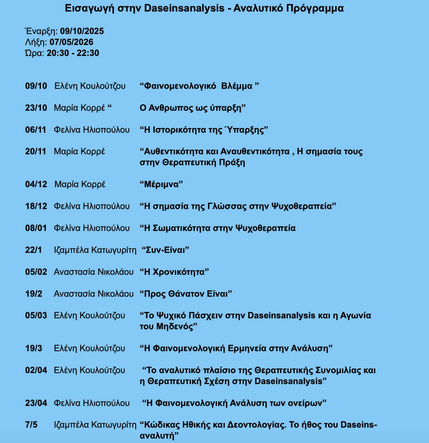 Θεωρητικό σεμινάριο:”Εισαγωγή στην Daseinsanalysis” Οκτώβριος 2025-Μάιος 2026